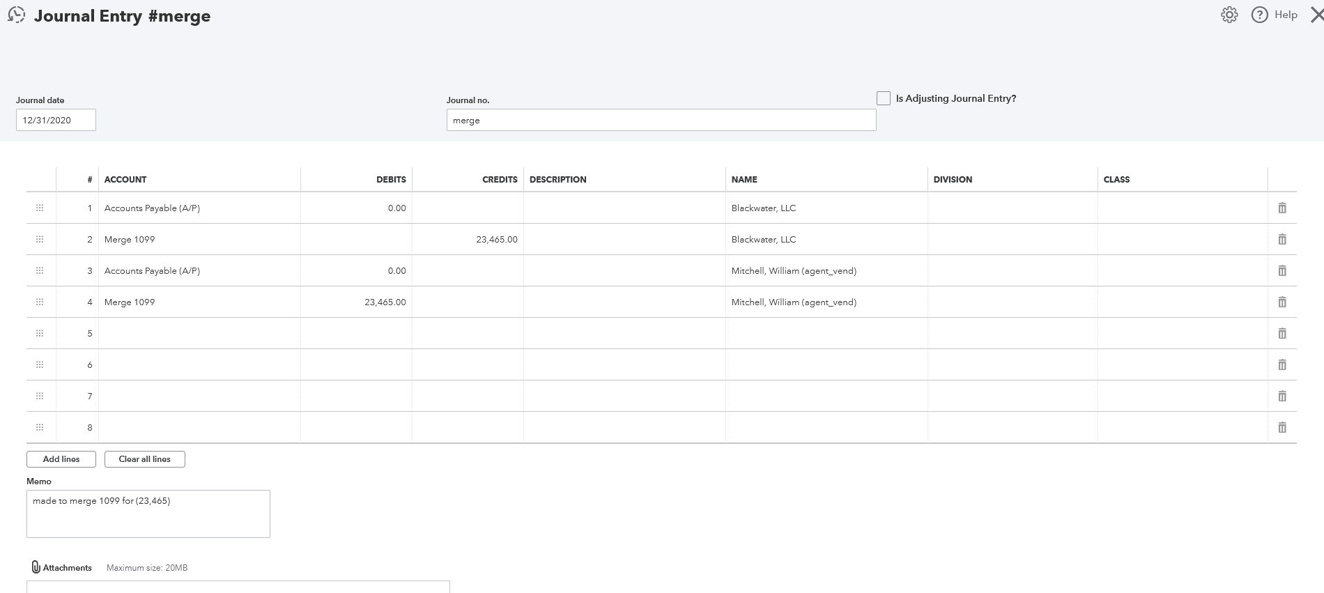 - Accounts Payable – set to 0.00 makes the JE and note show in vendor profile