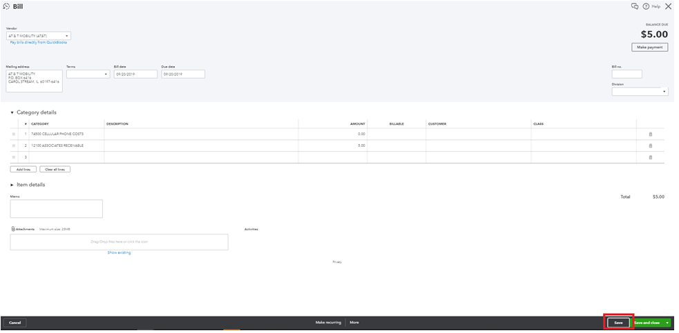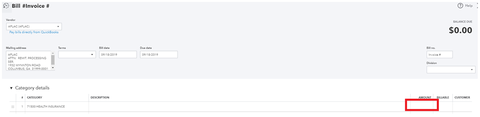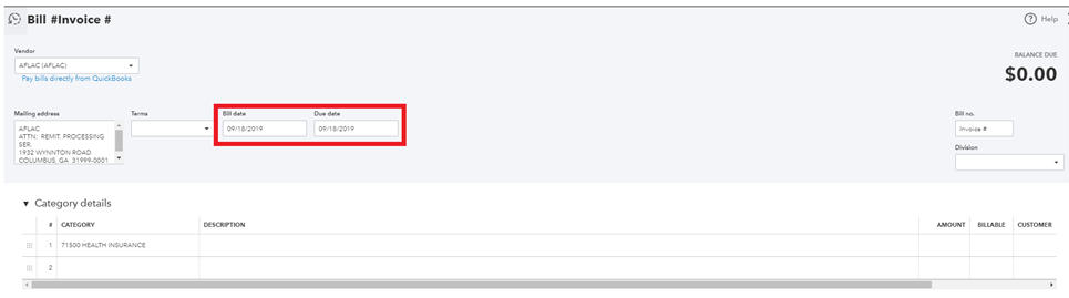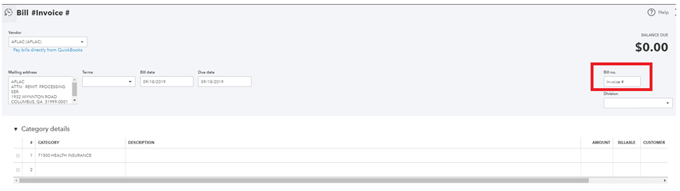 Enter the Bill/Invoice # if there is one. (Check with your accounting team for what they would like used here in the event a bill comes with no due date or invoice number)