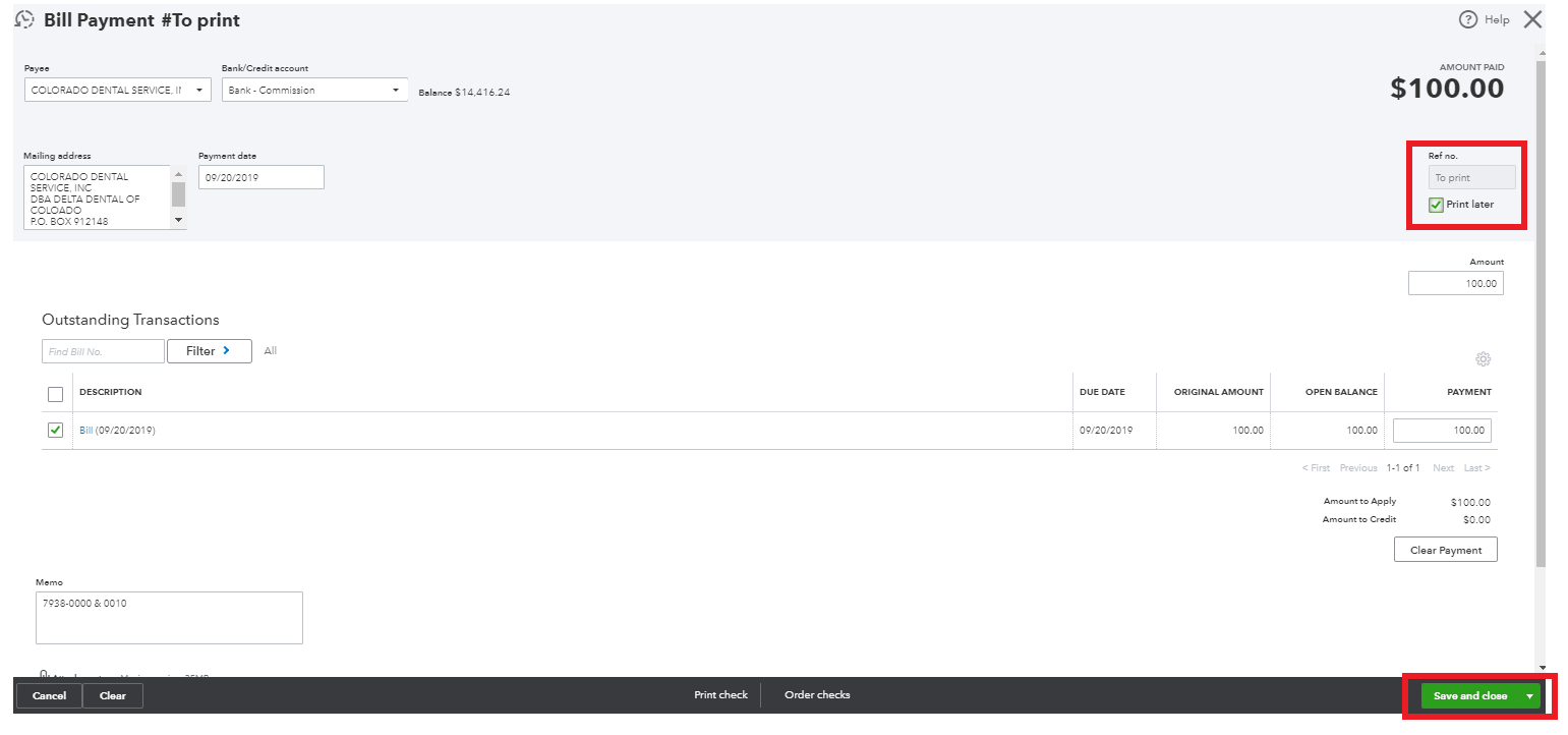Select the correct bank account that the payment will be coming out of. Then select the “Print Later” checkbox. Then click the green “Save and close” button.