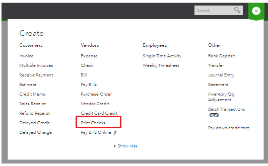 When you are ready to process the payment of the bill, go to the + sign in the upper right corner of Quickbooks. Select “Print Checks”.