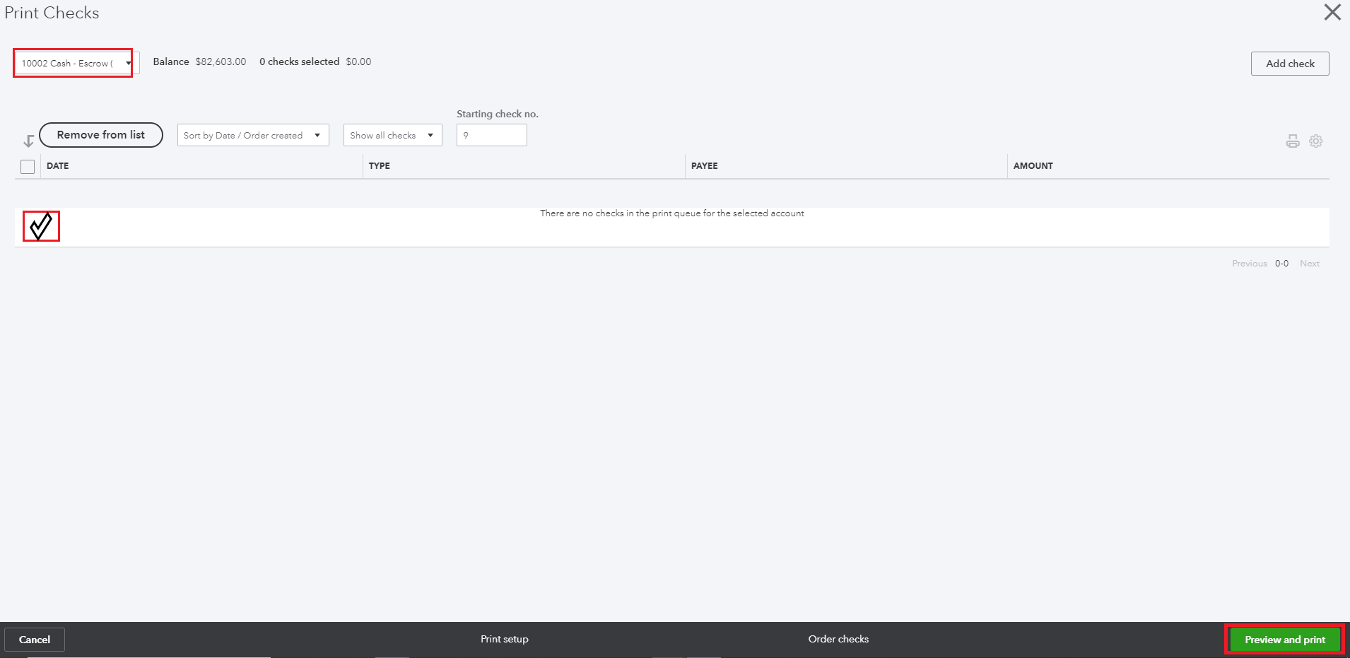 Here you will see a list of the bill payments you have queued up. Select the bill you are ready to print a check for/ACH/EFT. Select the account you would like the payment to come out of. Then click the green “Preview and Print” button.