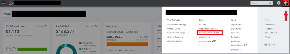 In the upper right-hand corner, click the gear symbol and select “Recurring Transactions”