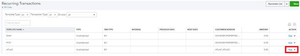To the right of the vendor you would like to add a bill for, select “Use”.