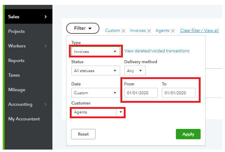 Click "Filter" and set the type to "Invoices". Under "Customer" select "Agents". Enter the date on the invoices you pushed from Broker.Ez. (Note: this is the date on the invoice, not the date you pushed them from Broker.Ez to Quickbooks)