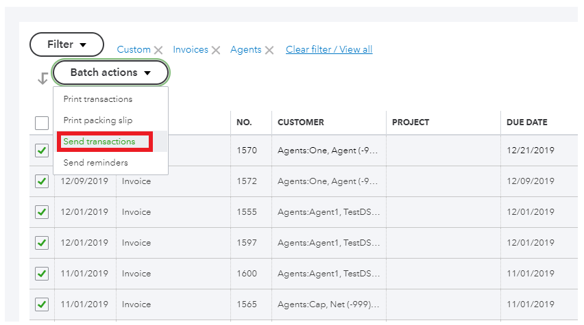 Scroll through the list and check the boxes for all the invoices you would like to send out. Then under "Batch Transactions", select "Send Transactions".