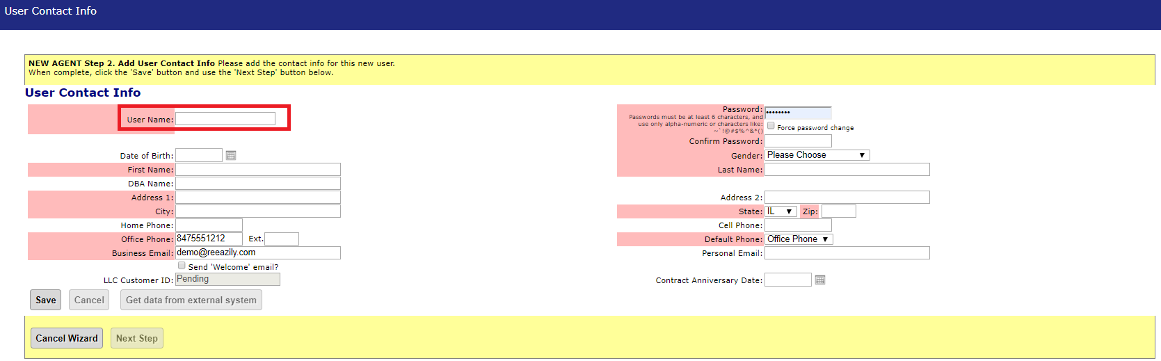 Create a user name for the agent, typically we choose the first letter of their first name and last name.