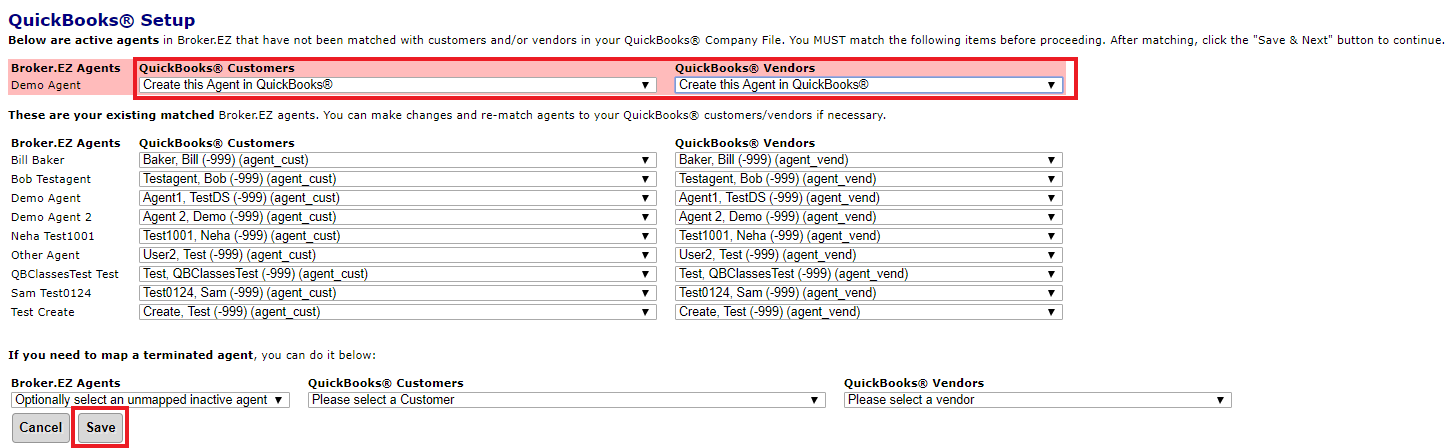 Select "Create this Agent in QuickBooks" from both drop down menus. Then select "Save".