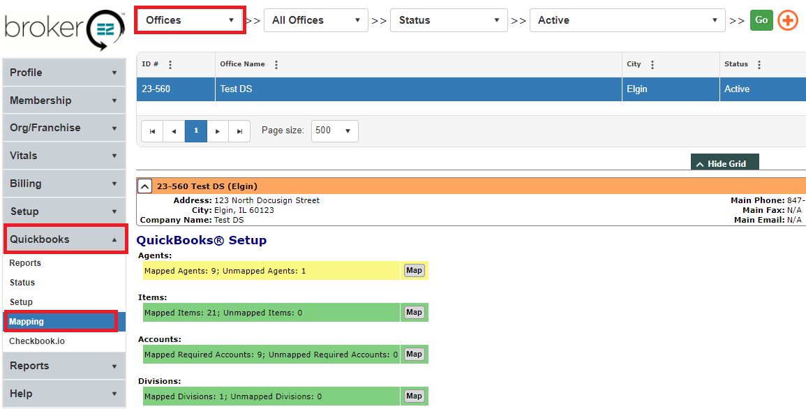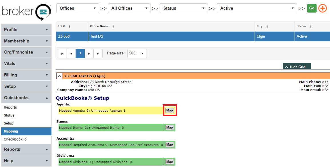 The next step will be to map the Agent. On the left-side panel, under the "Quickbooks" menu, select "Mapping". Any item needing to be mapped will be yellow.