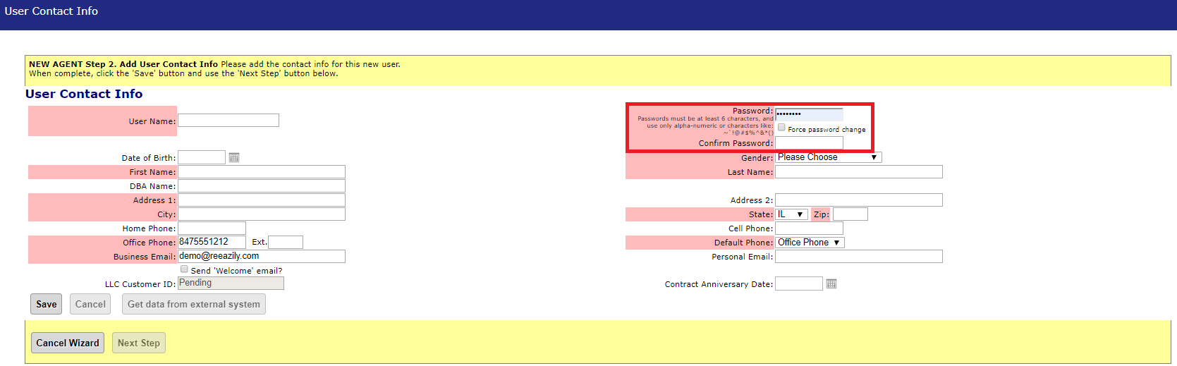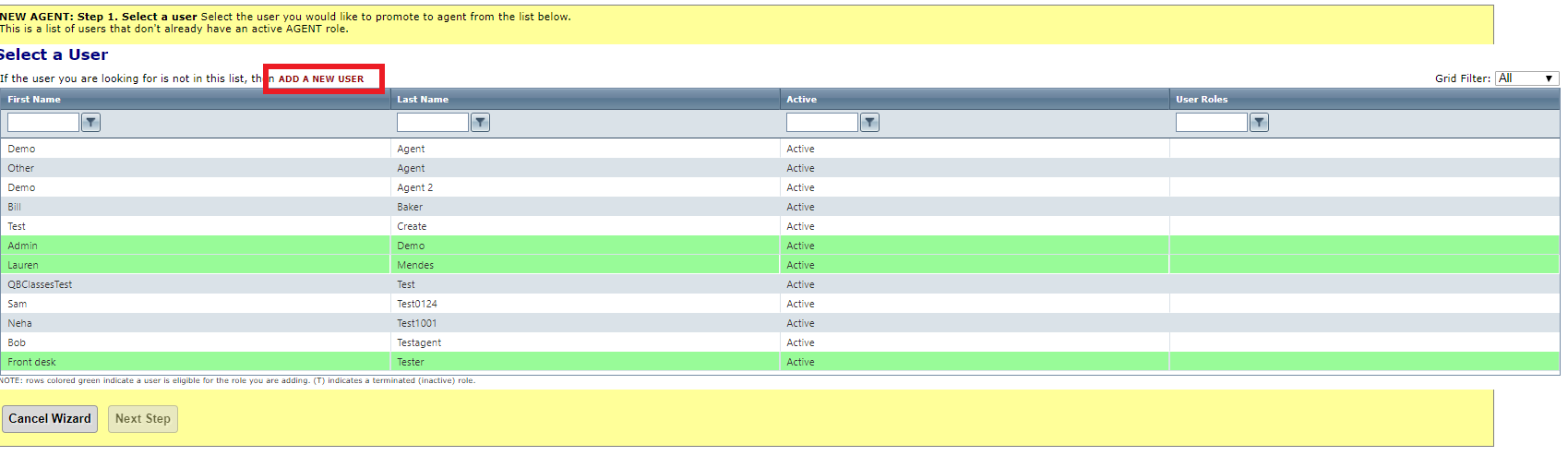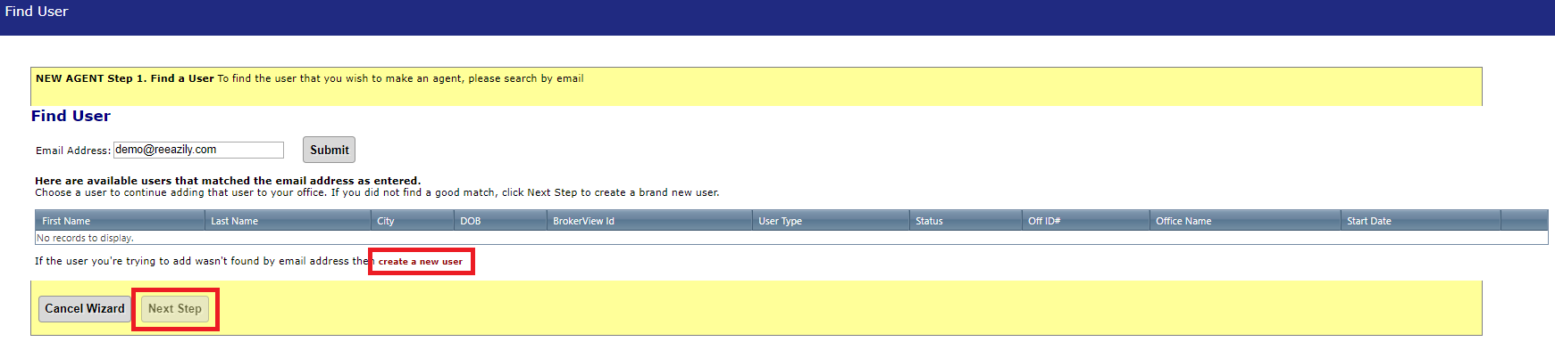 The system will then check too see if the agent is already in the system (it most likely wont be). Click the red "Create a New User" link. Then select next step.