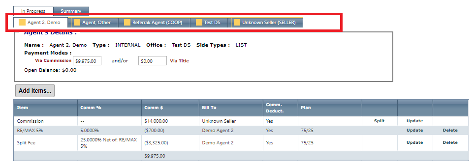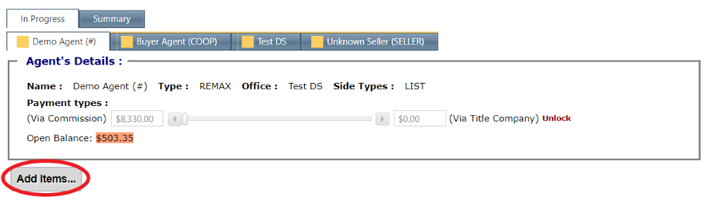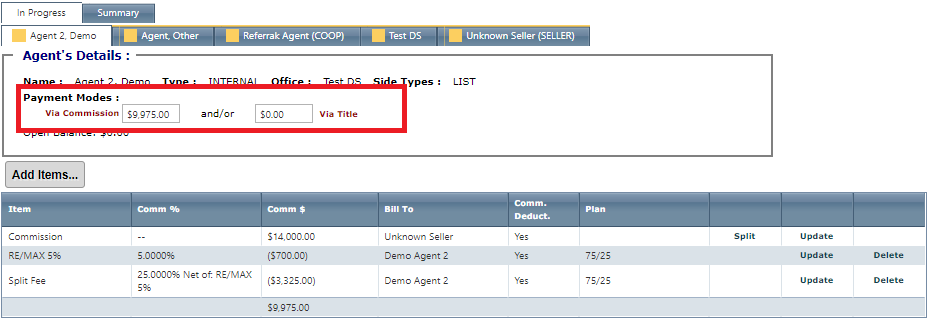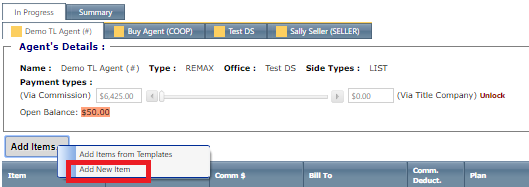 You may select whether the items will be paid out of the commission account or by title. You can accomplish this by entering the payment the agent is receiving in one of the 2 boxes below. You will want to do this for all the tabs.