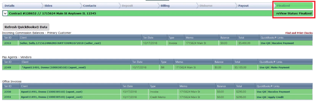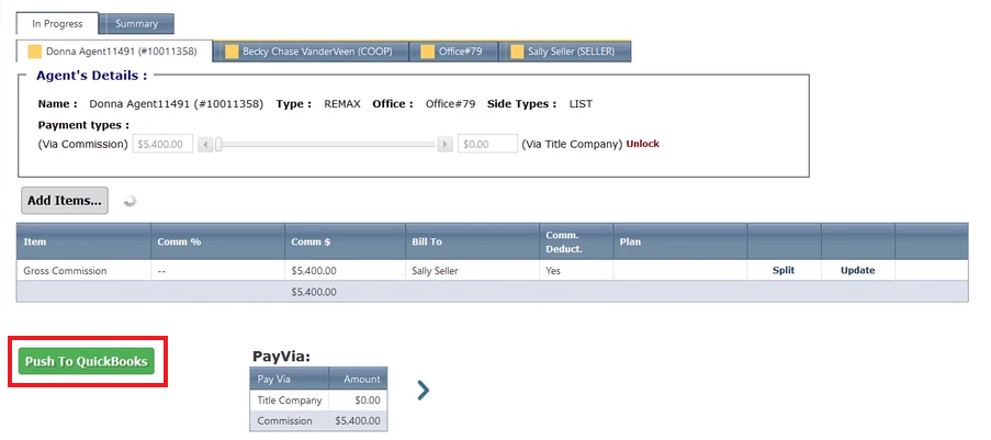 Pull up the billing tab of the deal you want to close. Change the deal to “closed” in the header. Ensure the gross commission/agent billing hasn’t changed since the deal was under contract. Then select the green “Push to QuickBooks” button.