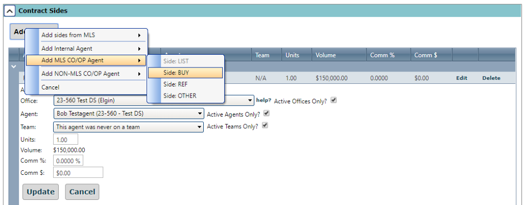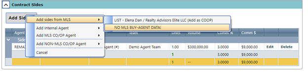 Select “Add Side” to add the Co/Op brokerage information. If the information is in the MLS, you can add this information with one click.