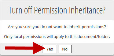 - To set unique permissions, click the Inherit Permissions then click Yes in the confirmation popup window (see below).