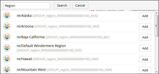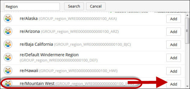 - If you give access to users in the Region “Mountain West,” first find the region and then click Add in the Add User/Group menu (see below, indicated by the arrow).