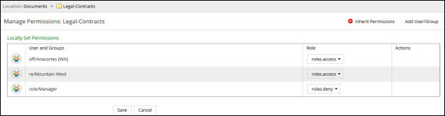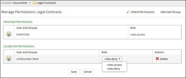 - By default, roles.deny will be selected. This means that specific Region will be denied access to the specific folder or document.