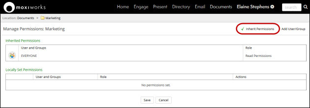 - NOTE: By default the folder or document to which you are adding permissions is set to inherit its parent’s permissions (see above, circled in red). The Content Admin can either set a unique set of permissions on the new folder or document or add to the inherited permissions.