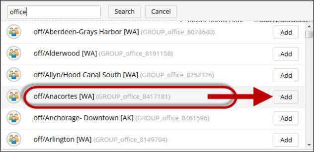 - If you then give access to users in the Office “Anacortes,” first find the office and then click Add in the Add User/Group menu (see below, indicated by the arrow).
