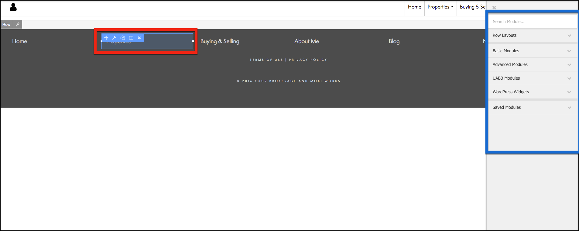 - Use tools in the module on the right to easily drag and drop blocks into your Footer. (See red arrow below)