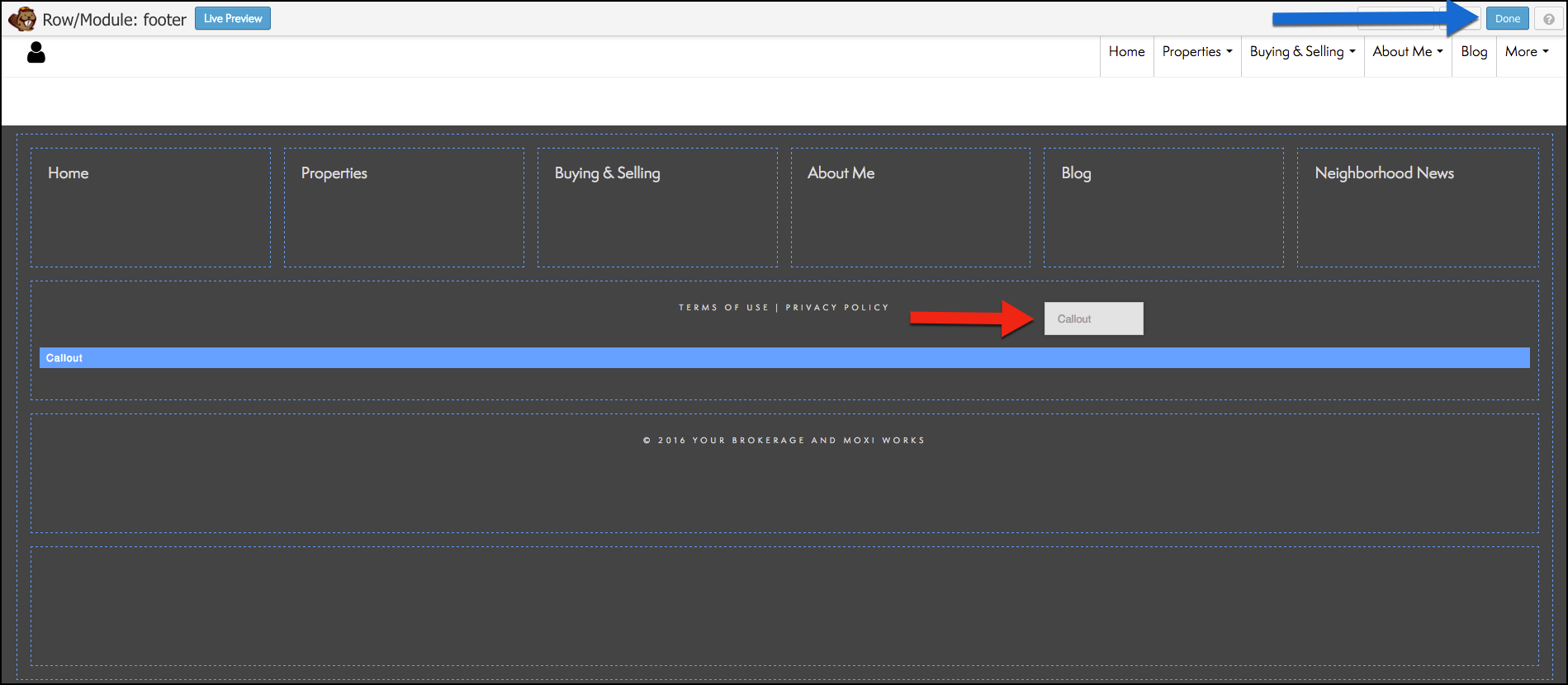 - Once you are finished updating your Footer, select Done in the top right corner. (See blue arrow below)