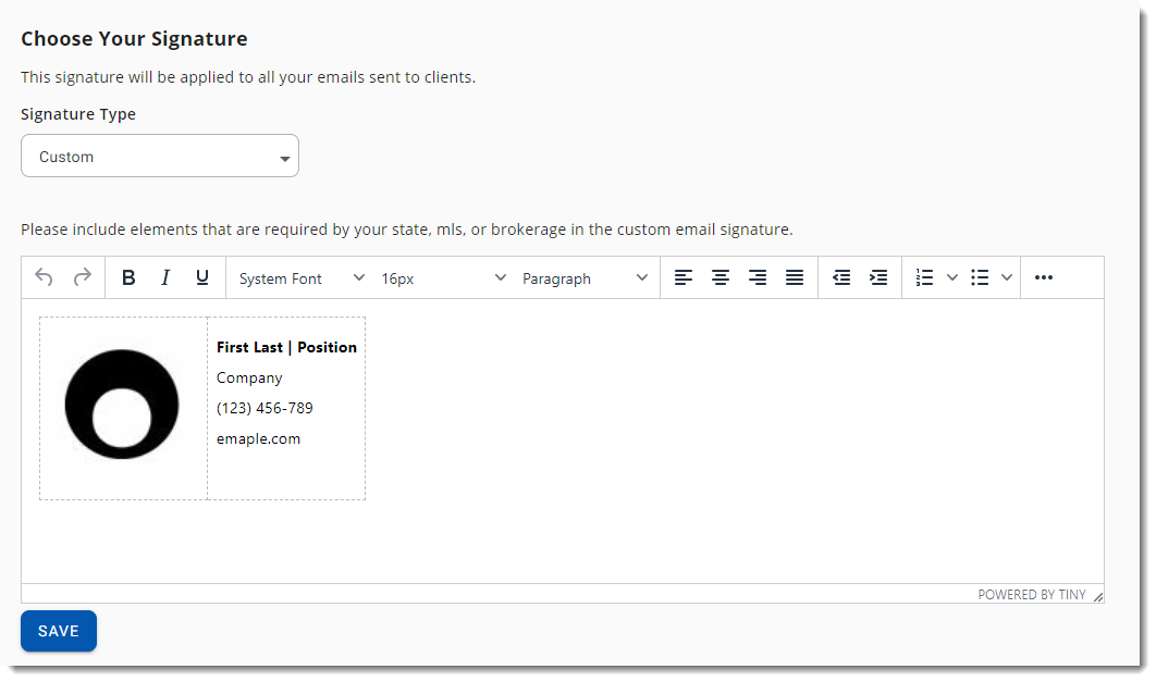 Emails sent from the MoxiWorks suite of products will include a signature with your name and contact information. Depending on your brokerage settings you can choose how this signature will display and if you can include any custom content like photos or additional disclaimers or a link.
