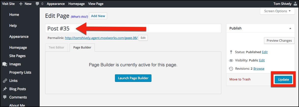 When you create a page for your Agent Website using our Page Builder, it will create a title for the page like “Post #35”. To create a new title for this page