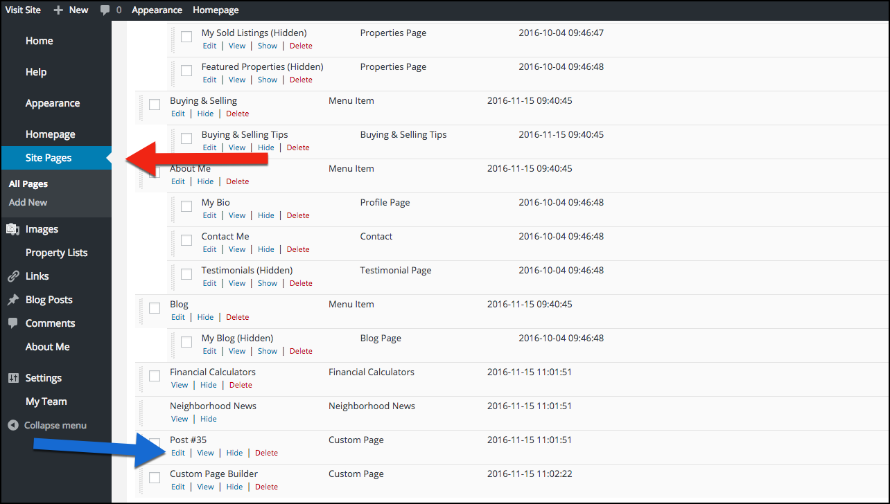- Find the page on your Site Pages (See red arrow below).
